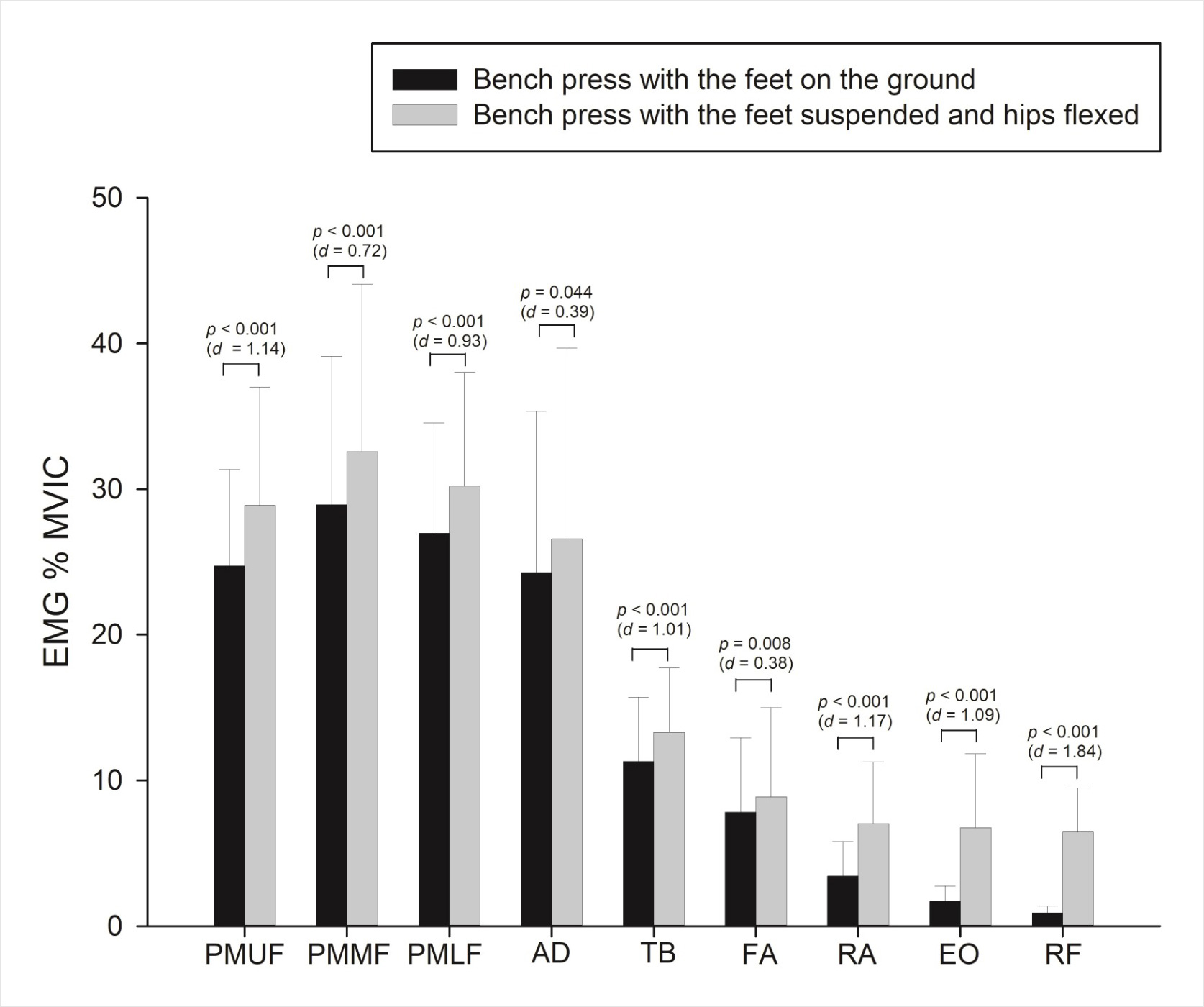 Konu ile ilgili yapılan çalışmada ayaklar ile yerde ve aktif kalça fleksiyonu ve 90 ° diz fleksiyonu ile yirmi genç erkek deneğe, (1RM) hesaplaması yapılmış. Daha sonra, elektromiyografik aktivite değerleri her iki bench press durumunda (ayaklar yerde, aktif kalça fleksiyonu ve dizler 90 ° iken) % 60 1RM’de kaydedilmiş. Sonuçlara göre kalça ve dizler fleksiyonda iken(görselde b) bench press yapmak anlamlı ölçüde daha fazla kas aktivasyonu üretiyor. Kısaca bu çalışmada bacaklar havada iken, Pektoralis majör en büyük aktivasyonu gösterdi, bunu anterior deltoid ve triseps brachii izledi. Ek olarak, kalça ve diz fleksiyonu (görselde b) ile bench press yapılırken core bölgesinin stabilize edilmesi ihtiyacı nedeniyle karın kasları daha fazla aktivasyon sağladı.
