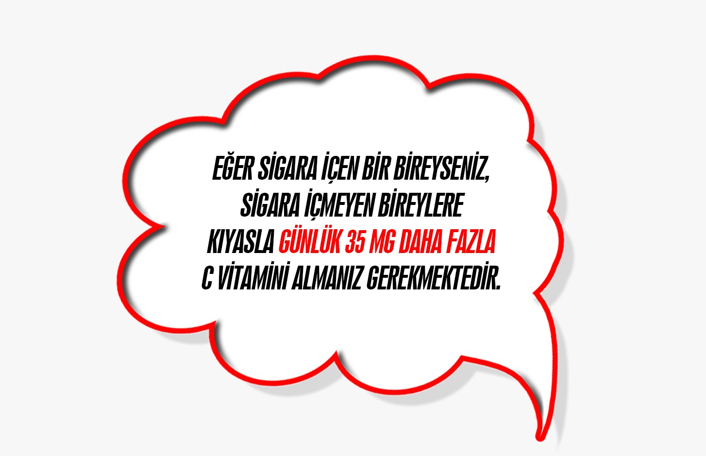 Eğer sigara içen bir bireyseniz, sigara içmeyen bireylere kıyasla günlük 35 mg daha fazla C vitamini almanız gerekmektedir.