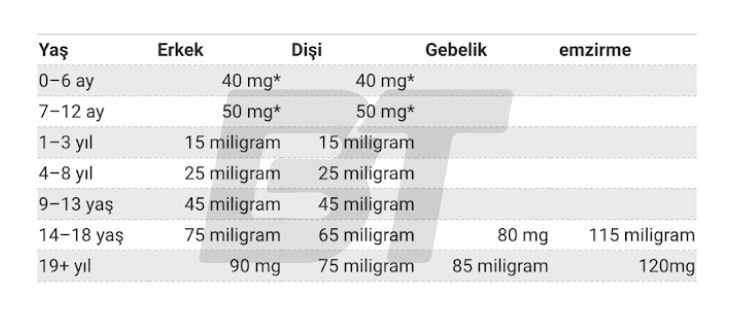 Aşağıdaki tablodan yaşa ve cinsiyete göre sağlıklı bireylerin besin gereksinimlerini karşılamak için yeterli günlük ortalama alınması (RDA) gereken C vitamin miktarlarına ulaşabilirsiniz: