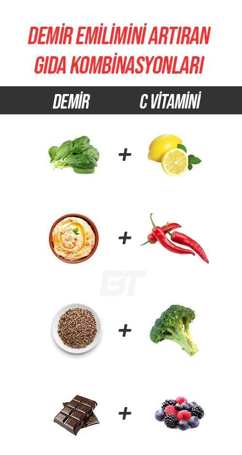 Bitkisel gıdalardaki demirin biyoyaralanımı düşüktür. C vitamini, bitkisel gıdalarda bulunan hem olmayan demirin emilimini arttırarak vücut tarafından daha iyi bir şekilde kullanılmasına olanak sağlar.