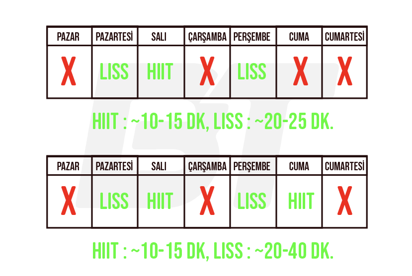 Konuşma testini çabanızı ölçmek için kullanabilirsiniz. Hala konuşabildiğiniz ve 10 üzerinden yaklaşık 4-5’lik çabayla çalıştığınız sürece bu LISS olacaktır. Tam bir cümleyi tamamlamak zor geliyorsa ve 7-8’lik bir çaba varsa bu HIIT olacaktır. Programda ilerlediğinizde bir seans da 15 dakikayı aşmayacak Yüksek Şiddetli Aralıklı Antrenman (HIIT) dahil edebilirsiniz. Tercih ettiğiniz kardiyoyu aktif dinlenme gününde ya da kuvvet antrenmanı ile arasında en az 6 saat olacak şekilde planlamanız daha faydalı olur.