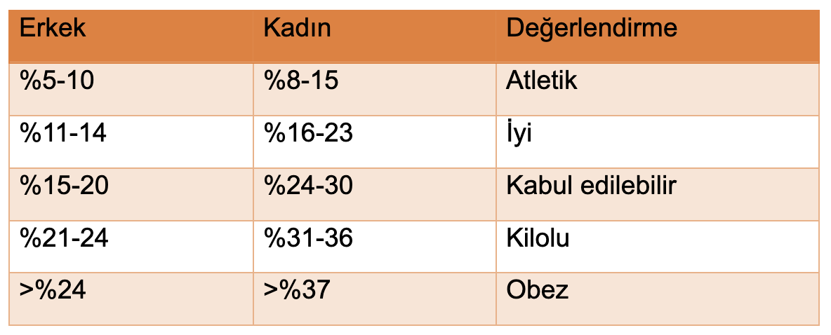 Sağlıklı vücut yağ oranları aşağıdaki tabloda gösterilmiştir: