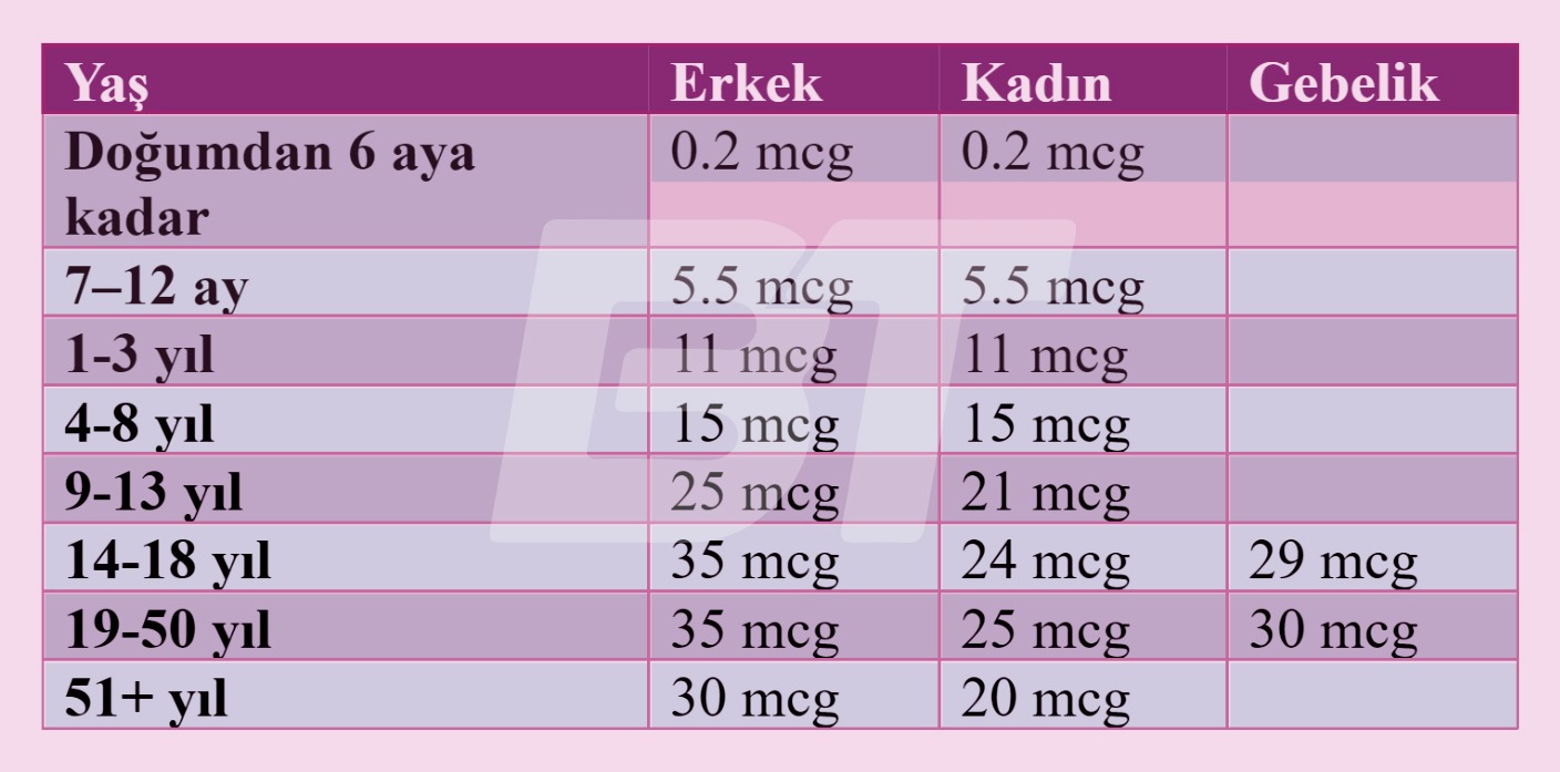 Krom, eser minerallerden bir tanesidir ve bu sebeple insan vücudu günlük olarak belirli bir miktarda kroma ihtiyaç duymaktadır. Yaşa ve cinsiyete göre günlük alınması gereken krom miktarına aşağıdaki tablodan ulaşabilirsiniz: