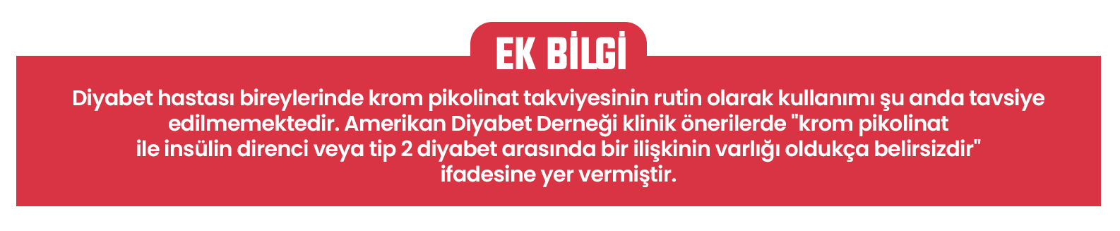 Egzersiz ve diyet yapan, tatlı krizi yaşayan, iştah kontrolü sağlayamayan ve insülin direnci olan bireyler, uzman gözetimi eşliğinde krom pikolinat takviyesi kullanabilirler.