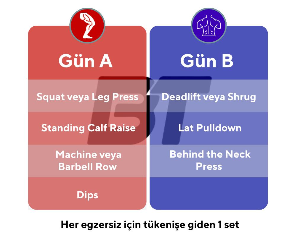 Bu sistemde bir antrenmanda az sayıda egzersiz (4-5) yapılır ve her egzersiz için tükeniş ötesine giden birer set uygulanır. Bu sayede tüm setler olabilecek en verimli şekilde yapılabilir ve kısa sürede kaliteli antrenmanlar çıkarılır. Aşağıda Mentzer’in kitabında verdiği, aralarında 5-8 gün dinlenme ile uygulanan iki antrenman günü örneğine ulaşabilirsiniz.