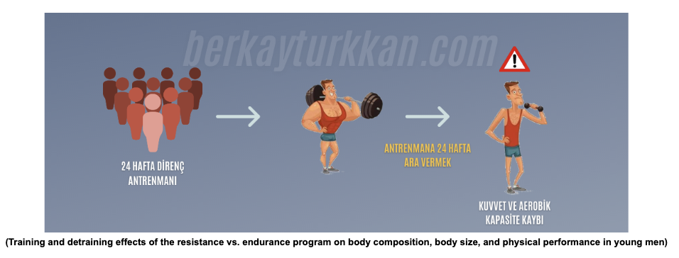 Kolej çağındaki genç erkeklerle yapılan bir çalışmada, 24 haftalık direnç antrenmanı sonrasında ve 24 haftalık antrenmansızlık (detraining) sonrasında vücut kompozisyonu, kassal kuvvet, vo2 maksimum, vücut ölçümleri gibi bazı ölçümler yapılmıştır. Haftada 3 kez olmak üzere 24 haftalık antrenman sonucunda bütün parametrelerde gelişim sağlayan denekler 24 hafta sonra antrenmanı bıraktıklarında direnç antrenmanı kazanımlarını (kuvvet ve yağsız kütle artışı), aerobik kazanımlara göre (vo2 maksimum) biraz daha uzun bir süreyle koruyabilmiştir.