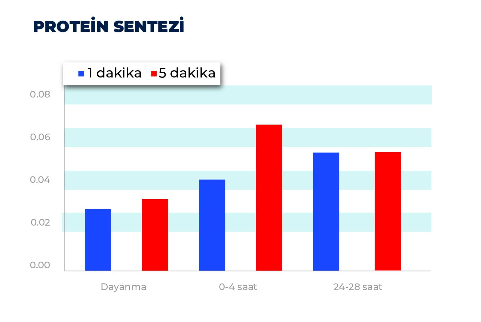 5 dakika dinlenen grup %14-15 daha fazla toplam hacim (set sayısı x tekrar sayısı) ve %13-17 daha fazla hacim yükü (set x tekrar x ağırlık) elde etti. Buna karşılık 5 dakika dinlenen grup antrenman sonrası 4 saatlik periyotta protein sentezi hızını %139 arttırırken 1 dakika dinlenen grup sadece %68 arttırdı.