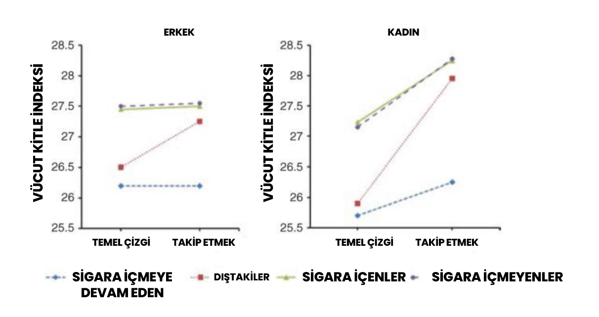 (Sigara içme durumuna göre 10 yılda vücut kitle indeksindeki ortalama değişiklikler. Örneklem büyüklüğü = 9.004 (3.365 erkek ve 5.639 kadın). Başlangıçta kadın katılımcıların ortalama yaşı 47,1, erkek katılımcıların ise başlangıçtaki ortalama yaşı 43,8 idi.)